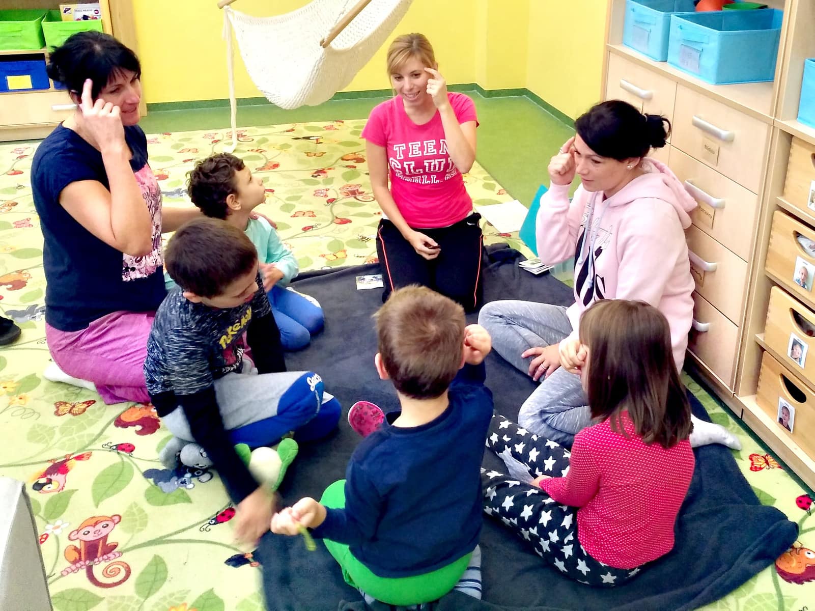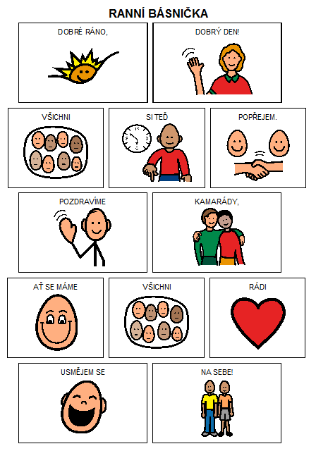 Následující fotografie ukazuje moment společného přivítání žáků a pedagogů v ranním kruhu. Ranní rituál zde začíná společnou básničkou. Její text se žáci zpočátku učili pomocí textu s piktogramy a obrázky.